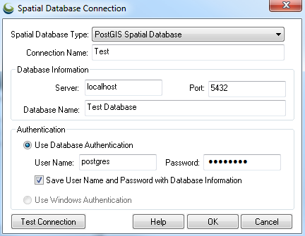 Complete this form by choosing OK. The new connection will now show in the Spatial Database Connection Manager.