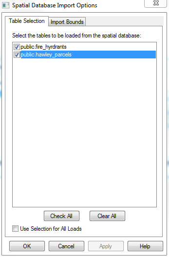 Choose Open Connection in the Spatial Database Connection Manager to bring up the Spatial Database Import Options window, allowing you to select which tables to load from the database into Global Mapper.