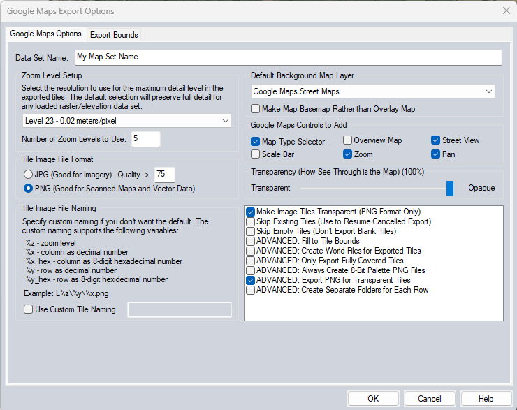 This dialog allows you to specify the display name of the map set in your web browser, the zoom level setup, the Google Maps API key to use, the format of the imagery, add a custom tile file naming scheme and some additional options. There is also an Export Bounds panel which allows the user to set up the portion of the loaded data they wish to export.