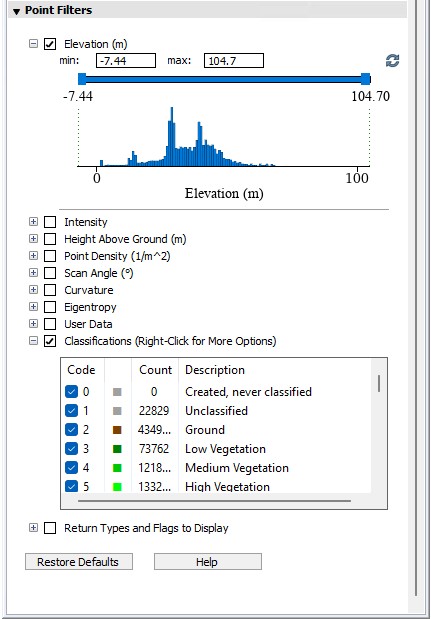 Flags are used in some datasets to identify certain lidar types (Synthetic, Key-point, Overlap, Withheld, Edge of Flight line, None). Uncheck any of these options to keep points of this type from displaying in the active workspace.