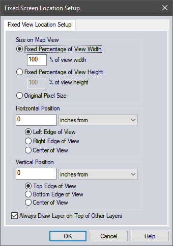 Selecting the Open Data File at Fixed Screen Location command first prompts you to select a file to load, then displays the Fixed Screen Location Setup dialog (pictured below).