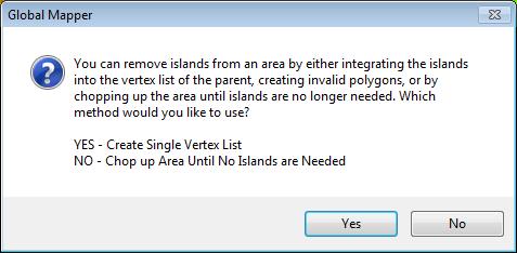 Select No to chop or subdivide the area features with islands to preserve the holes. This will split the parent area along the major and/ or minor axis of the island features.