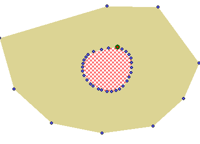 When an area feature / polygon contains a hole inside of it, this hole is represented as an island feature. An island can be edited, moved, and deleted like another area, but is a subset of its parent feature. Because an island is a hole inside of another area feature, its area will be subtracted from the parent area during measurement operations. The island area will display with a red hatch fill pattern.