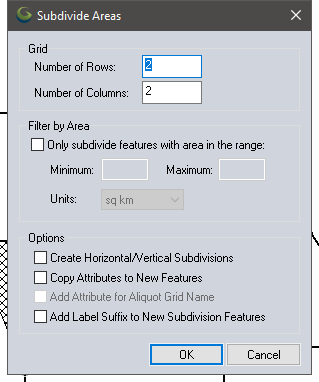 Once selected, the Subdivide Areas dialog will be displayed. In the Subdivide Areas dialogue (below), a range of areas can be specified - only features with a calculated area in that range will get subdivided. Features larger or smaller than that will be left intact.