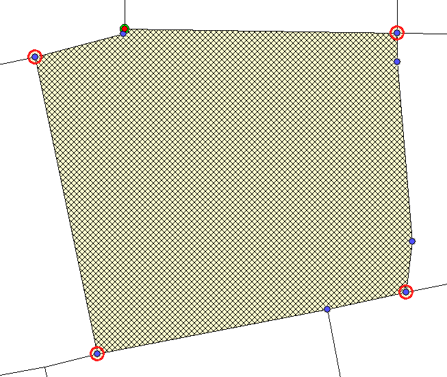 As you can see, the area to be subdivided is not strictly a quadrilateral, but by selecting the corners, a reasonable subdivision can be accomplished, as indicated below: