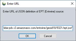 Entwine Point Tiles (EPT) provide a method to stream tiles of lidar data into Global Mapper. If the EPT (Entwine) Lidar Tiles option is selected, the Enter URL dialog (pictured below) will display prompting the user to enter the URL of the JSON definition for the source.