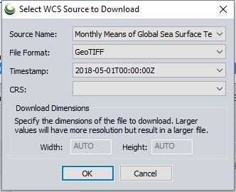 When connecting to a WCS service, an additional dialog will display to further specify the download request. Specify the File Format, and other applicable values.