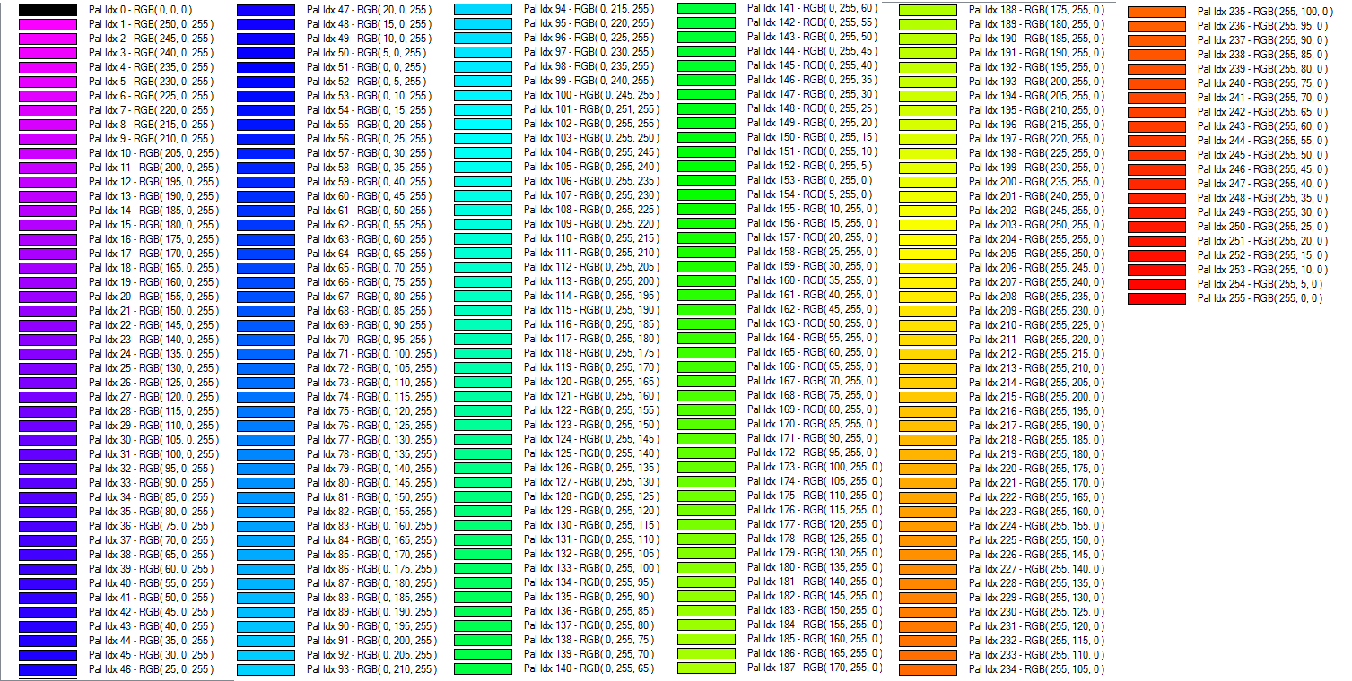 This palette creates an 8-bit per pixel grayscale image with no color map stored in the image. Black will be stored as zero with varying shades of gray up to white with a value of 255.