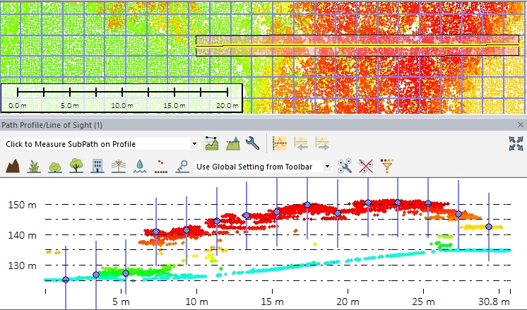 The second image simulates a 2 meter bin size on a higher resolution point cloud. This bin size will process relatively quickly on this point cloud, but could be increased to 1 meter to help with removing low vegetation or including steeper slopes in the ground classification: