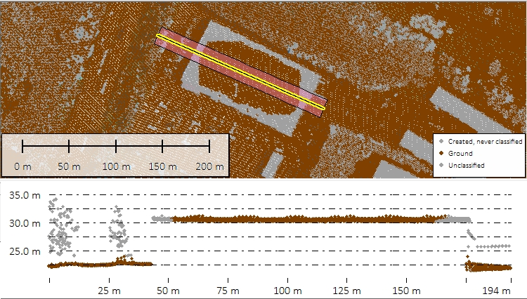 This is part of the first filter, and compares the local minimum to neighbors in progressively larger areas. This helps to remove building roofs and other built environments from the ground category, since there are no ground returns inside those areas. Since the filter progressively builds to the maximum building width value, be aware that larger values will increase processing time.