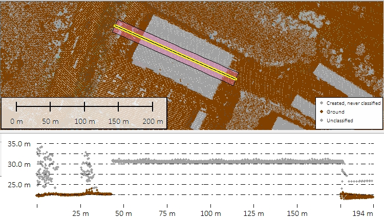 To remove large building roofs from the ground classification, specify the maximum building width. Larger values will cause longer processing times, but will help to remove large commercial and industrial building roofs from the ground classification.