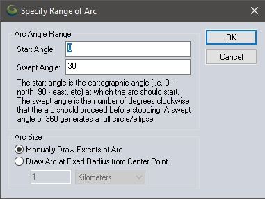 Arc Size - There two options for determining the distance of the sides of the arc. Choose the Manually Draw Extents of Arc option to click and drag on the map to dynamically size the arc line. Or specify a distance in Draw Arc at Fixed Radius from Center Point to define the radius the line will be drawn at, measuring away from the clicked location.