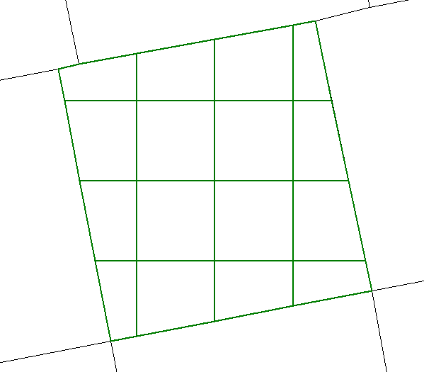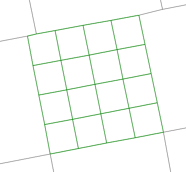 The following image illustrates the result of subdividing an area into a grid containing four rows and four columns, with the Create Horizontal/Vertical Subdivisions option checked. Note that the lines that define the subdivisions run horizontal and vertical, rather then following the direction of the sides of the area.