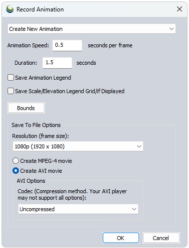 Save Scale/Elevation Legend/Grid if Displayed - The map scale, elevation legend, and grid will auto-populate in Global Mapper when relevant data is loaded, as enabled in Configuration. Check this box to also include them in the animation recording.