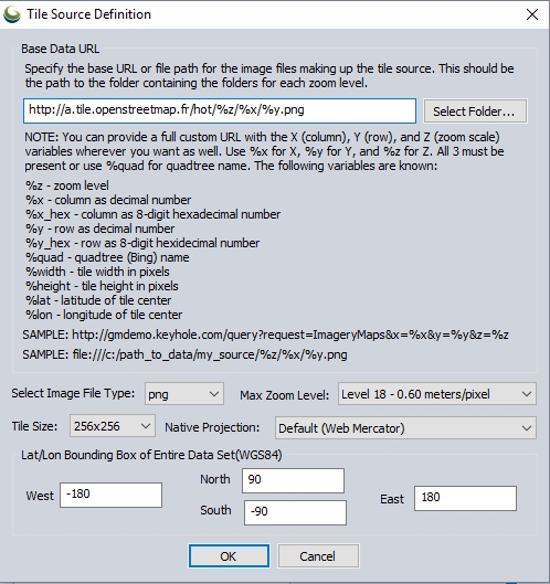 A URL with variables named %x (column), %y (row), and %z (zoom scale) in the URL can also be used, so that the URL can be setup however the data source requires, rather than using the default expected URL setup.