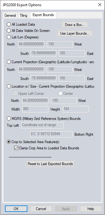 Note: Regardless of the method used to specify the bounds, the exported data will be generated in the current global display projection.