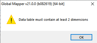 Note: Global Mapper does not currently support EASE 2.0 type gridded data. EASE-2 type data will fail to create a definition, showing an error message: Data table must contain at least 2 dimensions