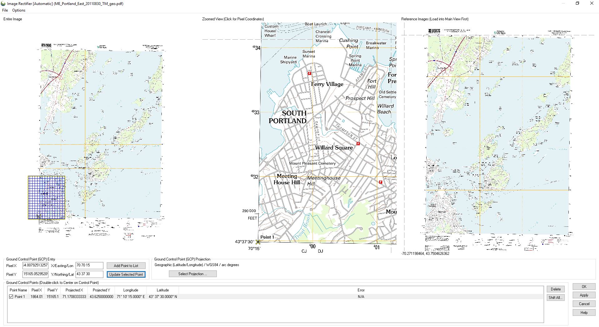 - If the data to be rectified has a coordinate grid on it, such as a scanned USGS DOQQ, those coordinates can be used as the basis of rectification. The location of the point is selected in the Zoomed View, and the real-world coordinate is then manually entered into the Ground Control Point (GCP) Entry field for X/Easting/Lon and Y/Northing/Lat as appropriate .