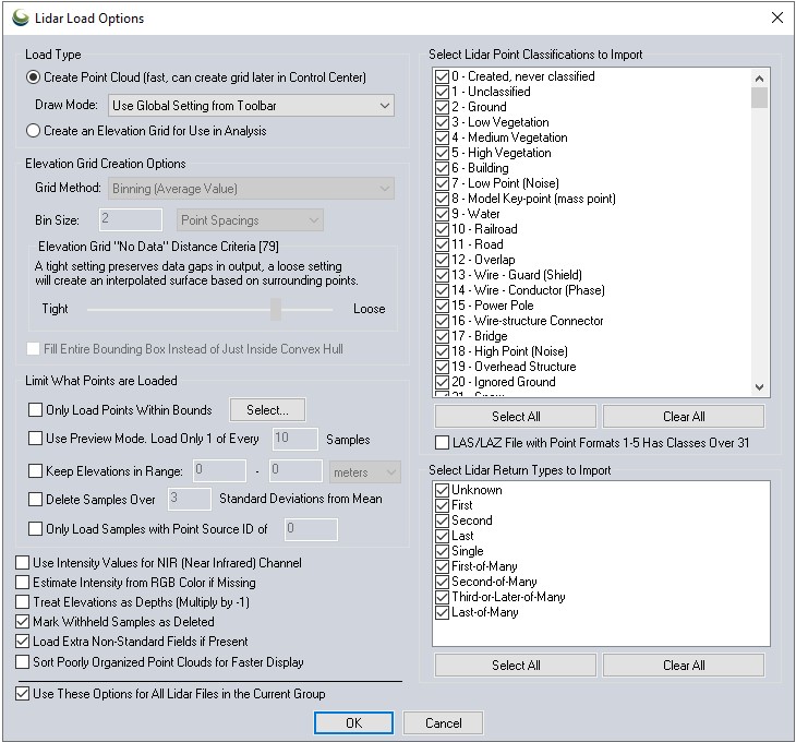 Create an Elevation Grid for Use in Analysis - Create an elevation grid from the selected lidar data upon load, rather than drawing the data as a point cloud. Selecting this option activates the Elevation Grid Creation Options.