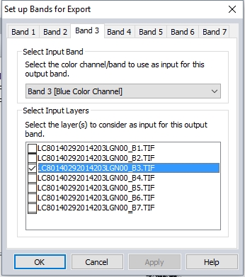 The Set up Bands for Export dialog will appear. Specify which Layer to include in Band 1. Then choose which color channel/ band within that layer will be included in the output band.