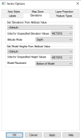 The elevations tab sets up the vertical (z value) attributes for the vector features in a layer. The layer settings will be overridden by individual object elevation settings specified in the Modify Feature Info dialog. The layer override the global settings for 3D vector display in the 3D View Properties.