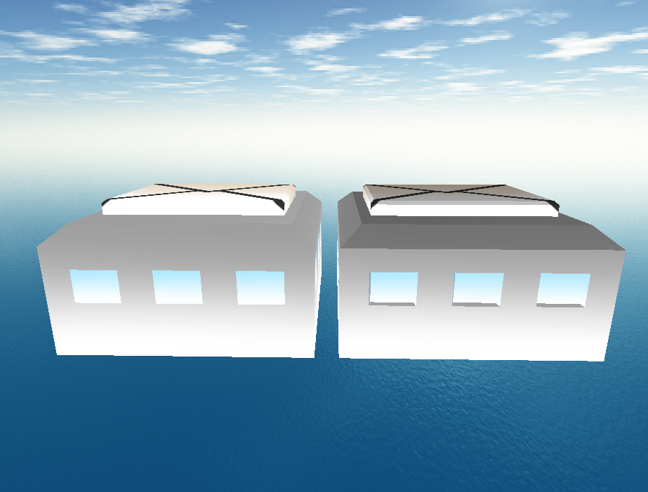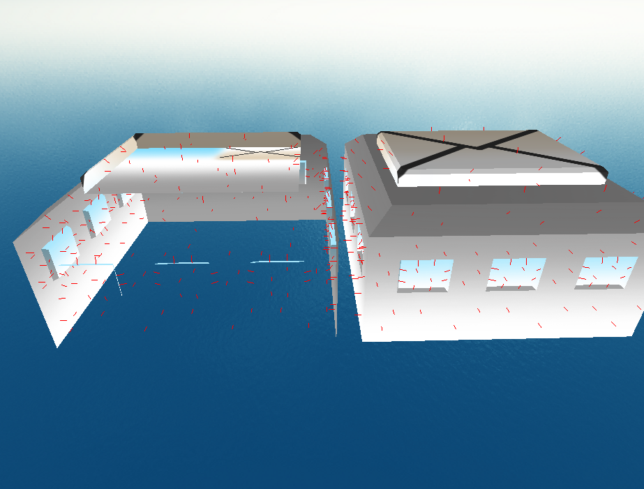 In this example the model on the left has had the faces reversed. With a structure like this, the effect is the turn the model inside out, so the textures ar facing the inside rather than the outside. The shadowing of the windows appears on the inside instead of correctly on the outside like in the original model on the right. Also note the differences in the roof. The second image displays the models with face normals shown in red vectors. The third image displays these models also with backface culling enabled. The walls closest to the camera have disappeared in the model to the right, because the camera is looking at the backside of the face now that the face has been flipped.