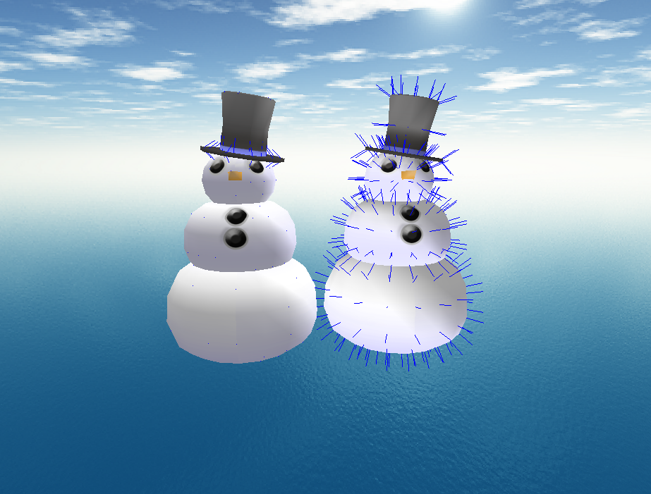 In this example, the snowman on the left has had the normals reversed, so that the shading of the lower two snowballs is darker and shadowed, compared to the original model on the right, where the bottom two snowballs are highlighted. The second image shows the models with Vertex Normal display enabled. The blue vectors point into the model on the left (where the vertex normals have been flipped), and point out of the model on the right, which would be a more typical face orientation for a 3D object such as this.