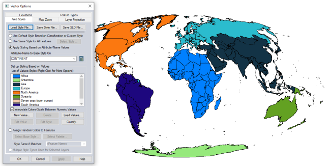 The following area styles were generated from the default data (countries) using the CONTINENT attribute. the Load Values button was selected, and then a base style with a solid fill and palette of colors was chosen: