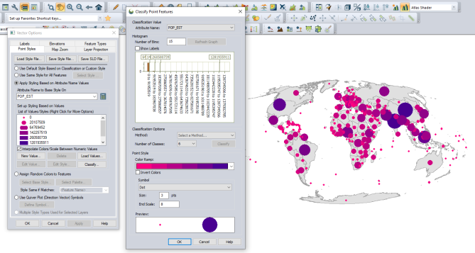 The following point styles were created using the Classify options. Because the attribute POP_EST is numeric the Classify option is able to be used. The color and size of the symbols were determined by the attribute value, classification set up, and point symbol options.