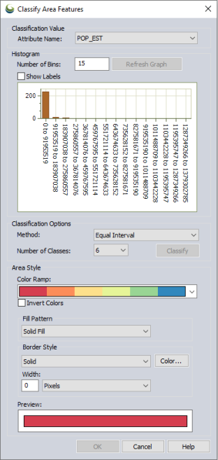 Select the Method and Number of Classes for the feature classification. Available methods are Equal Interval, Equal Count (Quantile), and Natural Breaks (Jenks). Click the Classify button to classify the value based on the selected method and number of classes. This will be reflected in the displayed histogram.