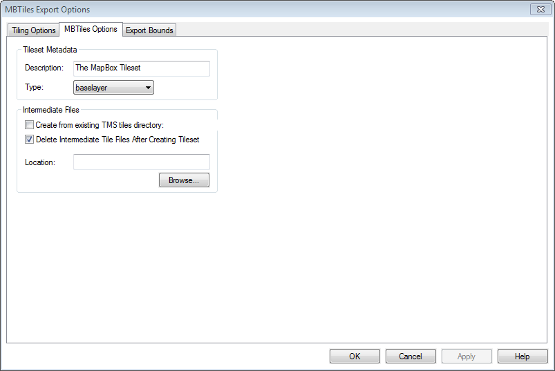 Delete Intermediate Tile Files After Creating Tileset - During the export process for MBTiles, Global Mapper will create a set of tile files. Choose the Location for the files. Indicate whether or not to deleted the intermediate files after the tileset generation is complete.