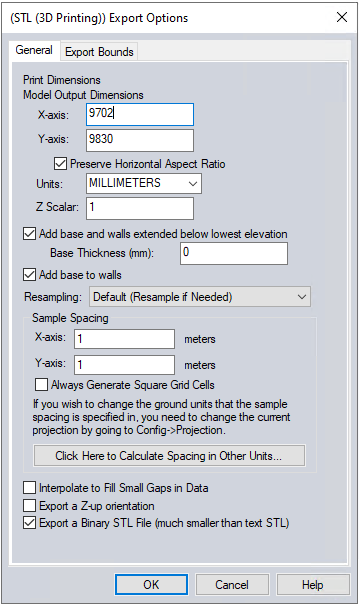 When selected, the STL (ASCII Text or Binary) File (Elevation Data Only) command displays the STL Export Options dialog which allows the user to setup the export. The dialog consists of a General options panel which allows the user to set up the grid spacing and vertical units, a Tiling Panel, a Coordinate Offset/Scale tab and an Export Bounds tab which allows the user to set up the portion of the loaded data they wish to export.