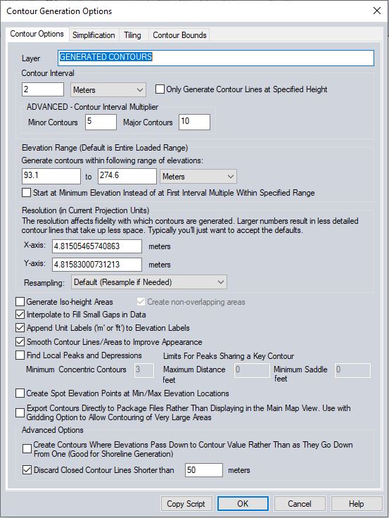 If lidar layers are chosen to generate contours from, the data is gridded at the start of the process at the specified resolution using the 'Bin Maximum' method with a default gap fill size.