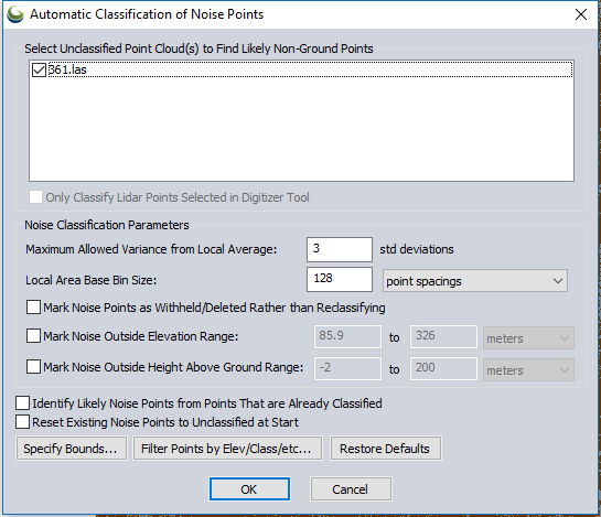 Mark Noise Outside Elevation Range - Manually define an elevation range, outside of which points will be defined as noise. The default values will be the minimum and maximum elevations for the loaded data.