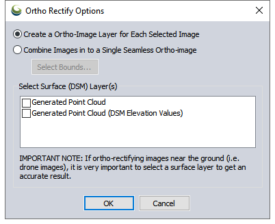 - If available specify a digital surface model (DSM) or point cloud layer in the Select Surface (DSM) Layer(s). While not required for 'quick rectification', this can help correct the scale of the image and remove some of the relief. However, note that camera positions typically store elevation in ellipsoidal height, and the height model of the surface layer should match that of the camera metadata. See Select Surface (DSM) Layer(s) for more information.