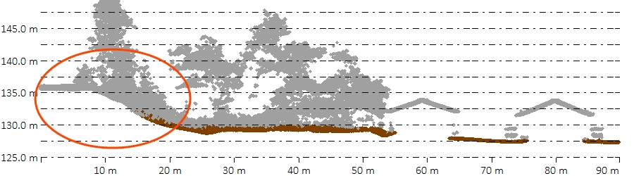 Note that many of the higher points in this case will already be removed by the setting described below in Removal of Likely non-ground points before the curvature deviation is checked.