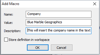 Value- This is the string that will replace the macro in the text element. It can not be blank. If the "In Workspace" box is checked, then this value will be stored in the workspace.