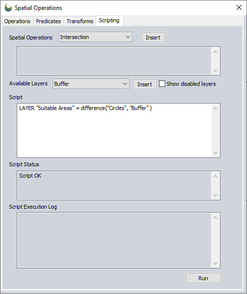 While editing a spatial script, the dialog constantly checks the script syntax, and gives the location and reason for the first syntax error it encounters, if there are any. The Run button is enabled only if there are no syntax errors in the script. After creating a Spatial Operations script in this dialog box, click Run to execute the entire script. To run only a portion of the created script, select a section of the script and hold the Control key when you click Run to execute only part of the script that is selected in the edit box.