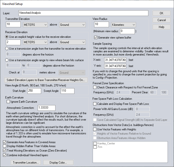 The Viewshed Setup dialog (pictured below) will appear, allowing you to set up the viewshed calculation.