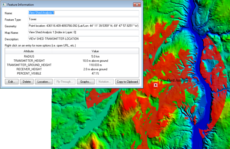 In addition, a small radio tower point will be created at the selected transmitter location. When selected using the pick tool, this point displays information about the viewshed analysis as shown below.
