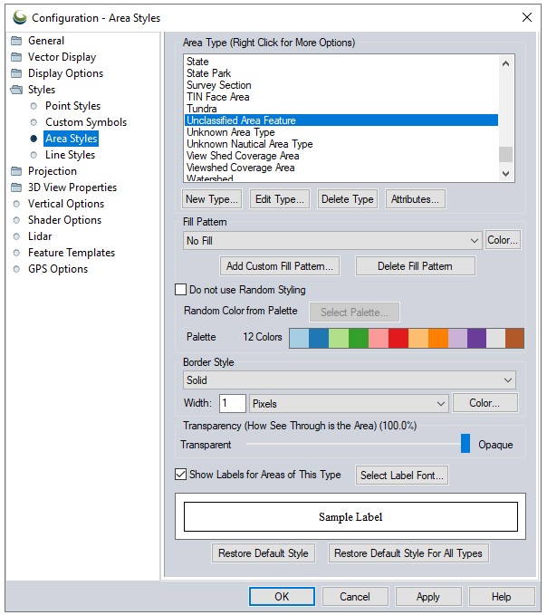 The Area Styles section of the Configuration menu allows the user to configure how areas of a given type will be displayed in Global Mapper.