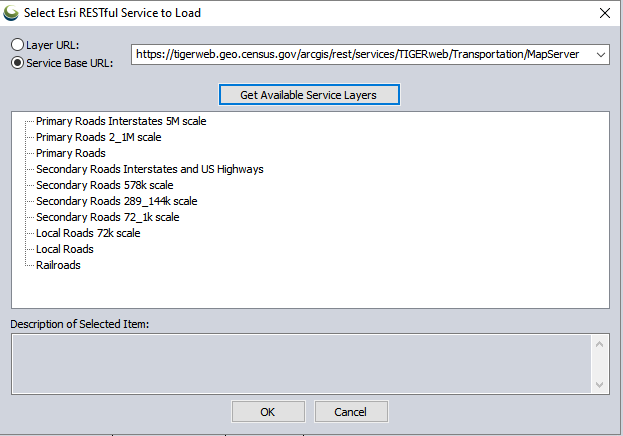 Once the layers are displayed, select one layer or service and click OK. If a service with multiple sub-layers is selected, all of the layers in the service will be added to the online source list.