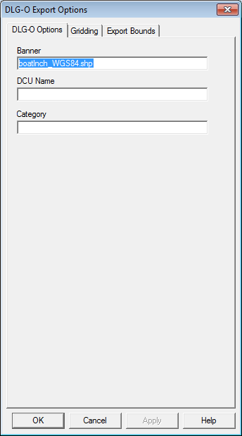 When selected, the command displays the DLG-O Export Options dialog (pictured below) which allows the user to set up the export. The dialog consists of a DLG-O Options panel which allows the user to set up the banner name, DCU (digital cartographic unit or quad name), and category name, a Gridding panel, and an Export Bounds panel which allows the user to set up the portion of the loaded vector data they wish to export. If possible, the fields on the DLG-O Options panel are automatically filled in with the best guesses available based on the currently loaded data. The user is free to change the values to fit their needs.