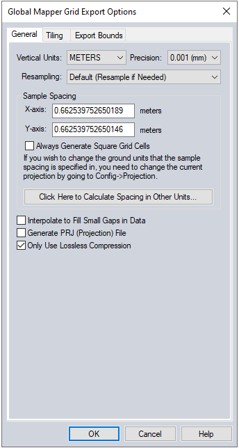 The Sample Spacing section allows the user to select the grid spacing to use when generating the file. The default value is the average of the grid spacings of all the currently loaded raster and elevation overlays.