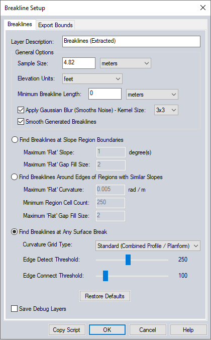 Slope - This option creates a slope grid instead of a curvature grid. When generating breaklines, it will use the parameters specified for the Find Breaklines at Slope Region Boundaries method in addition to the parameters in this section.