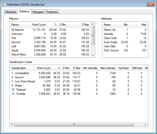 Lidar Metadata and Statistics
