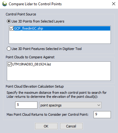 Specify the Max Point Cloud Returns to Consider per Control Point. The default value is 9. The results dialog will calculate the difference between the control points and the point cloud, stopping the search after finding the max number of point cloud returns closest to each point.