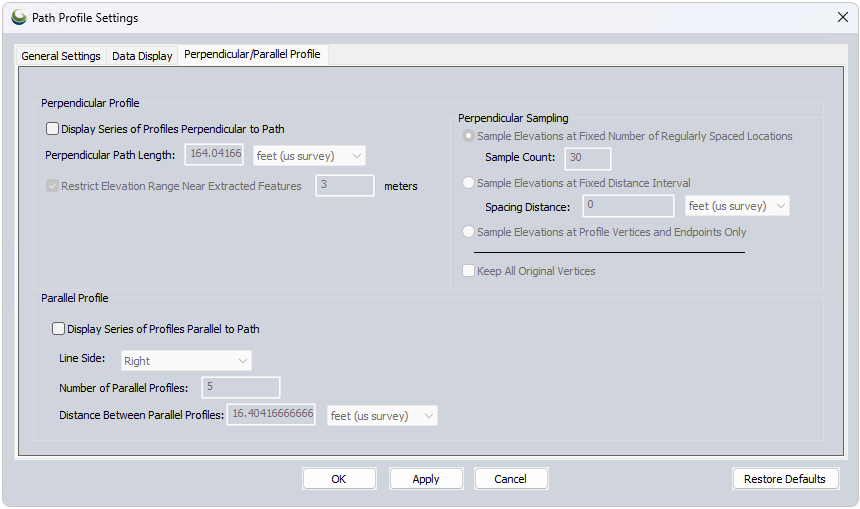Parallel and Perpendicular paths can be enabled by clicking the Path Profile Settings button from the Path Profile window, and choosing the Perpendicular/Parallel path profiles tab.