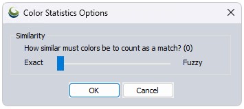 Use the slider to select how close colors must be to be declared a "match". When set to Exact (0), then the stored color values must match exactly. Any other value allows for slightly different colors to be considered the same. The usefulness of this depends on the type of data being analyzed. For example, when attempting to determine the roof color for building footprints, a non-zero similarity number is recommended, since many colors that look the same vary slightly in their internal representation.