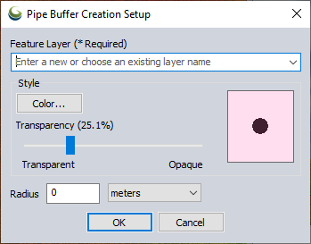 Created from a selected line feature, a pipe buffer creates a pipe measuring the specified distance perpendicular to the line segment. If the input line feature has elevation values the generated mesh will be placed vertically based on those values, otherwise the feature will be anchored to 0 elevation.